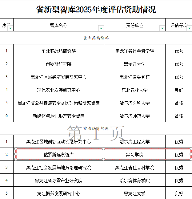 近日,黑龙江省哲学社会科学工作办公室公布了2025年度全省新型智库评估结果,我院俄罗斯远东智库在20家省级重点培育智库综合评比中再获“优秀”等次,彰显其持续领先的决策影响力与学术贡献力。