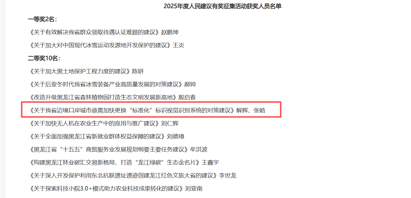 近日,黑龙江省委、省政府人民建议征集办公室公布了2025年度人民建议有奖征集活动获奖名单,经我校远东研究院俄罗斯远东智库推荐,美术与设计学院解辉、张晗撰写的《关于我省边境口岸城市亟需加快更换“标准化”标识视觉识别系统的对策建议》荣获二等奖。这是我校教师首次在黑龙江省委、省政府人民建议征集活动中获奖,该篇《人民建议》已获省政府副省长批示。